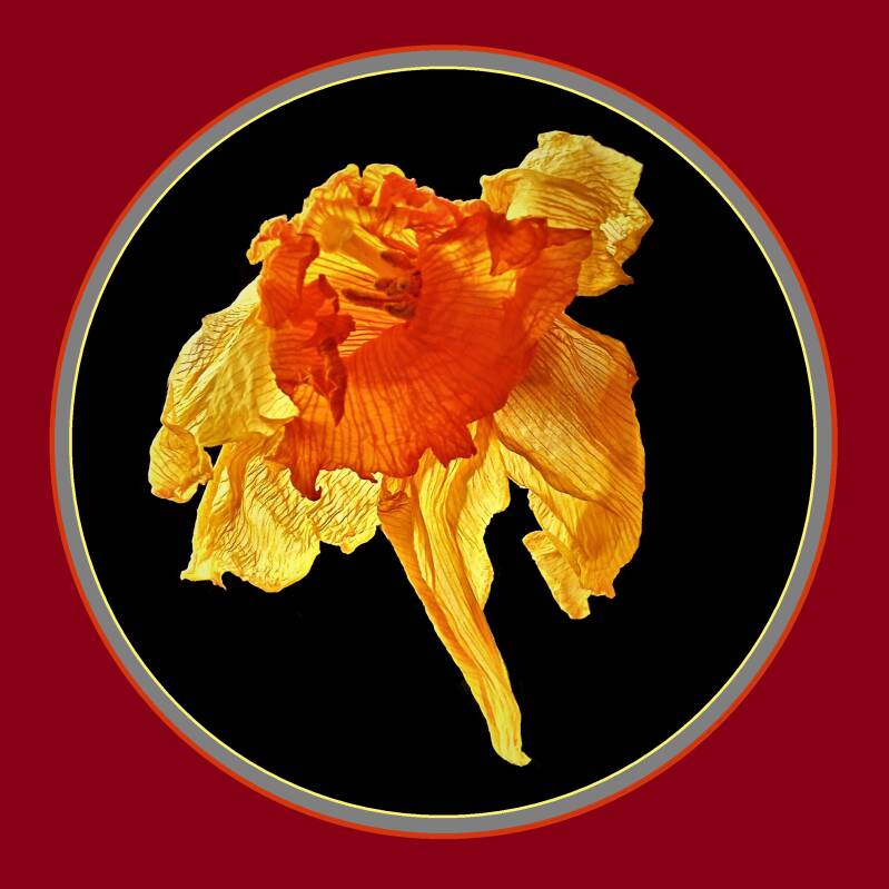 De compositie suggereert een esthetische appreciatie voor de cyclus van leven en dood, het zien van schoonheid in zowel bloei als verval. De contrasterende kleuren en texturen kunnen symbool staan voor de vergankelijkheid en kwetsbaarheid van het leven, maar ook de levendigheid die zelfs in vergane glorie gevonden kan worden. De omlijsting geeft het werk een klassieke uitstraling, alsof het de bloem in al zijn vormen wil eren. Het kunstwerk nodigt de kijker uit om stil te staan bij de details en de poëzie van verval te waarderen, waarbij de helderheid van de kleuren een herinnering is aan de pracht die in elk stadium van het leven schuilt. ©